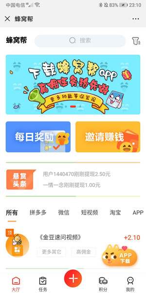 下载应用 蜂窝帮 分类: 数字金融 大小: 5.07 MB 系统: 安卓苹果 发布: 2020-03-14 10:01:52 浏览: 作者: 标签: APP截图 应用介绍 蜂窝帮,让您的闲暇时间变得更有价值。蜂窝帮APP是一款手机悬赏任务平台,悬赏、互助,帮人忙就能赚钱!用户在这里,不仅可以通过完成悬赏任务来赚佣金,还可以发布任务供其他用户完成。海量悬赏任务,让你的业余时间变得更有价值! 【平台特点】 最新应用 趣头条 泡泡头条 麒麟网 抖音极速版 彩蛋视频 贝壳转 蚂蚁看点 闪电盒子